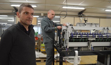 Le P-DG de Caire Lionel Astier, dans les locaux de Caire à Vendôme. En arrière-plan, un électrotechnicien travaille sur une machine servant à rouler des affiches.