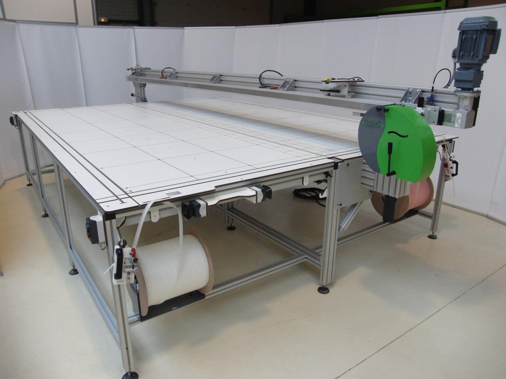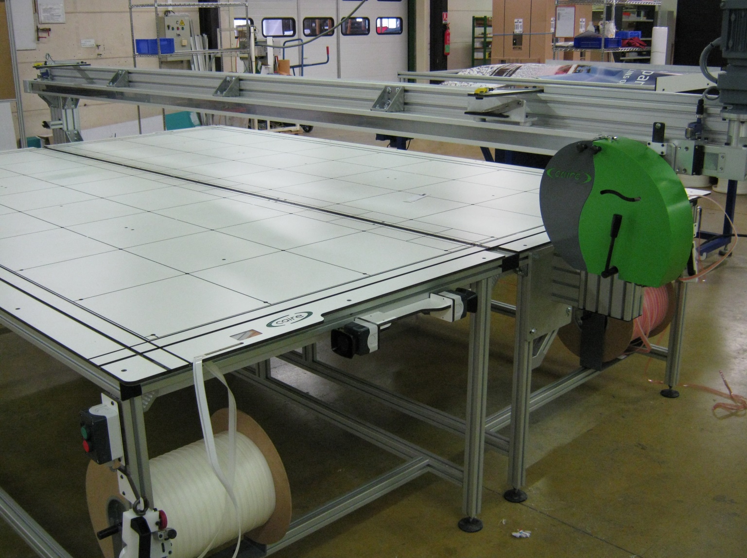 Cet équipement est conçu pour un assemblage manuel d’affiches grand format (jusqu’à 12 m²) en deux morceaux. L’assemblage s'effectue avec le ruban adhésif qui est appliqué à l’aide de la poutre transversale. Les bords d’affiche sont ensuite coupés, renforcés, zippés. L’affiche finie peut être roulée et évacuée par l’opérateur.